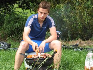 Nach der Pause nahmen wir unseren nächsten Streckenabschnitt in Angriff. Ziel war Tann in der Rhön. Anfangs leiteten uns sehr kleine Straßen über Wernshausen nach Wiesenthal. Inzwischen schien die Sonne recht stark auf uns hernieder, so dass wir eine weitere kurze Pause einlegten um Getränke aufzufüllen. Die Crew schaffte es auf diesem Streckenabschnitt immer wieder für die Radler präsent zu sein, auch wenn die Fahrzeuge nicht die ganze Zeit in Bikernähe blieben. Damit war eine kontinuierliche Versorgung sowohl mit Verpflegungsgütern, als auch mit Tourfotos sichergestellt-Danke Crew! Der starke Wind machte unterdessen den Radfahrern das Leben schwer. So bildeten sich recht schnell zwei Gruppen unterschiedlichen Tempos, welche um Kraft zu sparen sehr dicht beieinander den Windschatten der Vorausfahrenden nutzten. Anschließend an eine Pause in Wernshausen ging es das erste Mal über einen Schotterradweg weiter bis nach Glattbach und schließlich (nach einigen Minuten der Reorientierung) weiter bis Zella (Rhön). Hier wartete ein letztes Mal vor Tann unsere Crew auf uns. Die Vielzahl an kleinen Straßen führte zu einem umfangreichen Maß an Verwirrung, doch letztendlich erreichten wir nach einem weiteren langen Anstieg und einer noch viel längeren und schnellen Abfahrt Tann (Rhön). Die zul etzt genannte Abfahrt war dabei so lang, dass sie für die vorhergegangen Strapazen vollends entschädigte. Die Crew hatte derweil nach einem adäquaten Grillplatz für das Mittagessen Ausschau gehalten. Da ein solcher jedoch nicht aufzufinden war wurde improvisiert. Die Gruppe fuhr noch etwas weiter und hielt schließlich an einer größeren Wiese außerhalb des Ortes an. Der Grill war angesichts der knurrenden Mägen schnell auf Betriebstemperatur. Während, neben den fortwährend andauernden dummen Sprüchen, alle Anwesenden aßen, entschied sich die Tourleitung für eine Abänderung der geplanten Strecke. Statt weiter über, mit heftigen Anstiegen gespickte Straßen zu fahren, sollte uns der Ulsterradweg weiter Richtung Norden bringen.