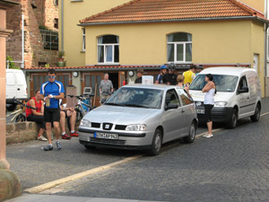 So lautete unser nächstes Ziel: Philippsthal an der Werra. Der Ulsterradweg bot uns dabei den perfekten Untergrund um dieses Ziel schnell zu erreichen. Der Wind war inzwischen sehr unauffällig, und die pralle Sonne wurde zeitweise von Wolken verdeckt. Das Fahrerfeld rollte dadurch sehr schnell, kurze Zwischensprints führten dabei zu zeitweise Raserei. Trotzdem blieb in dieser Phase auch genug Zeit um die tolle Landschaft zu bewundern und das typische 24-Stunden-Tour-Feeling zu genießen. Unsere Crew unterstützte uns hierbei wieder optimal, indem sie in regelmäßigen Abständen direkt am Radweg warteten und für uns sorgten. Das kulinarische Engagement der Crew reichte in diesem Jahr von selbstgemachten Salaten bis hin zu Muffins - perfekt für gestresste Radfahrer. Auch wenn das Begleitteam dieses Mal öfter als üblich allein unterwegs war, kam der Spaß nicht zu kurz. In Philippsthal angekommen verbrachten die Radler wieder einen Teil ihrer Zeit mit dem Auffinden der Crew in den ineinander übergehenden Ortschaften. Als dies jedoch gelungen war, nahte die Kaffeezeit. Endlich war es soweit, lange hatten schon viele der Teilnehmer gebettelt, doch erst jetzt gab es das selbstgemachte Backwerk zu naschen. Versüßt wurde diese Pause noch durch äußerst freundliche Anwohner die sich spontan dazu hinreißen ließen mit frischem Kaffee aufzuwarten. An dieser Stelle möchten wir nochmal unseren herzlichsten Dank hierfür ausdrücken. Allgemein wurden alle Tourteilnehmer überall äußerst freundlich begrüßt.